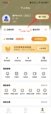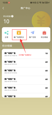 方式二:登录平台后,依次点击“个人中心”—“推广任务”—“看广告得积分”,每日15次,每次10积分。