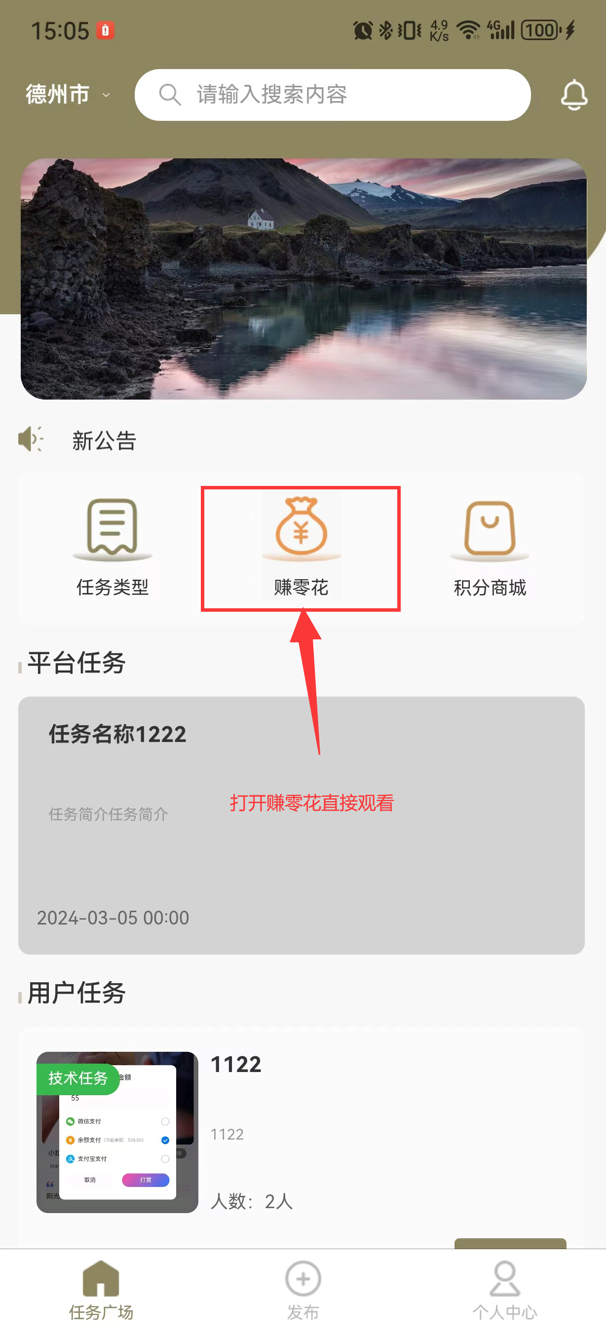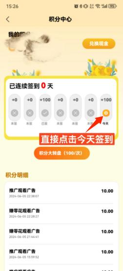 方式一:登录平台后点击“赚零花”看广告,每日15次,每次10积分。